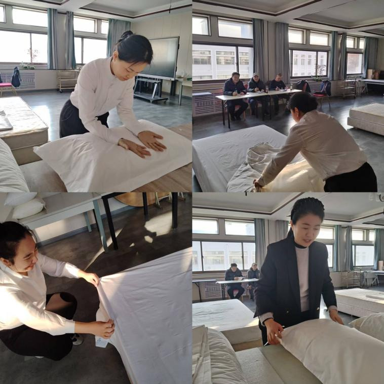 考核现场,教师们身着整齐的工作服,精神饱满地投入到操作中。他们熟练地抖动床单,精准地将床单四角塞入床垫下,动作流畅而规范。