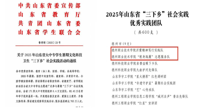 近日,从共青团山东省委等部门联合下发的《关于2025年山东省大中专学生暑期文化科技卫生“三下乡”社会实践活动的通报》中获悉,德州职业技术学院经济管理系“躬身践履”志愿服务队凭借暑期“直播助农”社会实践项目,获评山东省“三下乡”社会实践优秀实践团队。